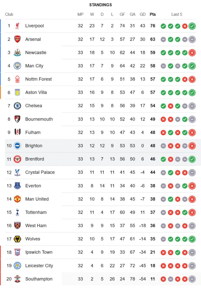 หลังเกมนี้ เบรนท์ฟอร์ดขยับมี 46 แต้มจาก 33 นัด ขึ้นมารั้งอันดับ 11 อย่างแข็งแกร่ง ไล่จี้ไบรท์ตันที่มี 48 แต้มเท่ากันแต่แข่งมากกว่า 1 นัด เกมนี้ทำให้โอกาสลุ้นพื้นที่ยุโรปของเบรนท์ฟอร์ดยังไม่หมดไป ในขณะที่ไบรท์ตันเริ่มเจองานยาก ต้องเร่งฟอร์มช่วงโค้งสุดท้ายหากหวังรักษาอันดับท็อปเท็นไว้ให้ได้