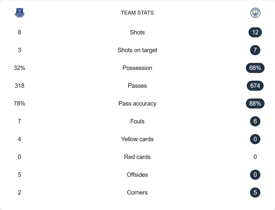 แมนเชสเตอร์ ซิตี้ครองบอลได้มากถึง 68% เทียบกับเอฟเวอร์ตันที่มีแค่ 32% เท่านั้น ซิตี้มีโอกาสยิง 12 ครั้ง เข้ากรอบ 7 ครั้ง ขณะที่เอฟเวอร์ตันยิงได้ 8 ครั้ง เข้ากรอบ 3 ครั้ง การผ่านบอลของทีมเยือนแม่นยำถึง 88% (674 ครั้ง) ในขณะที่เจ้าถิ่นทำได้ 78% (318 ครั้ง) การกระทำฟาวล์ใกล้เคียงกันที่ 7 ครั้งสำหรับเอฟเวอร์ตัน และ 6 ครั้งสำหรับซิตี้ โดยไม่มีใบแดงในเกมนี้
