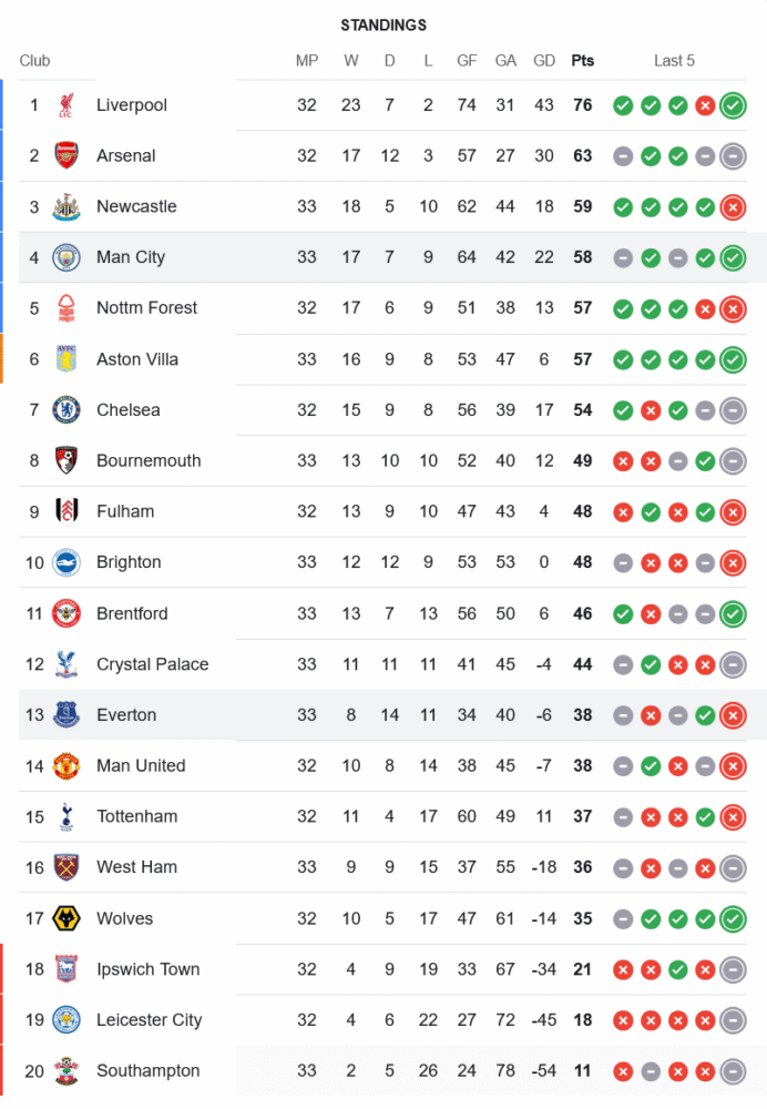 ชัยชนะในนัดนี้ส่งผลให้ แมนเชสเตอร์ ซิตี้ ขยับขึ้นมารั้งอันดับ 4 ของตาราง มี 58 แต้มจาก 33 นัด ไล่หลังนิวคาสเซิลที่อยู่อันดับ 3 เพียงแต้มเดียว เปิดโอกาสลุ้นพื้นที่แชมเปี้ยนส์ลีกเต็มตัว ส่วนเอฟเวอร์ตันยังคงรั้งอันดับ 13 มี 38 แต้มเท่าเดิม แต่สถานการณ์ยังไม่ปลอดภัย ต้องเร่งเก็บแต้มต่อไปเพื่อความอยู่รอดในฤดูกาลหน้า