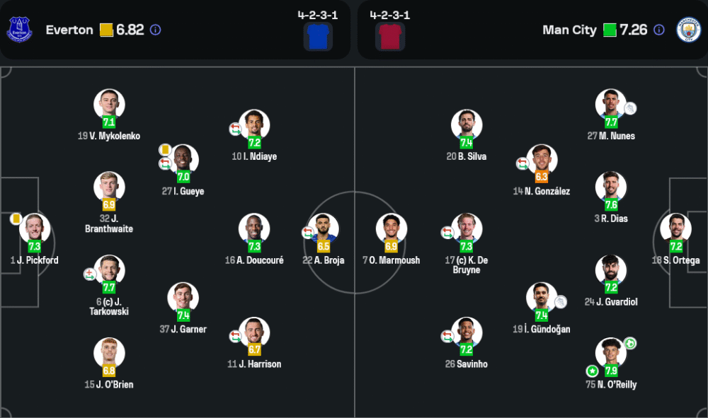 ครึ่งแรก แมนเชสเตอร์ ซิตี้ครองเกมได้ตามสไตล์ แม้เอฟเวอร์ตันจะวางเกมรับมาแน่นหนา แต่การต่อบอลของทีมเยือนยังไหลลื่นกว่าอย่างเห็นได้ชัด ซิตี้มีโอกาสบุกต่อเนื่องแต่ขาดความเฉียบคมในจังหวะสุดท้าย ขณะที่เอฟเวอร์ตันเน้นสวนกลับเป็นหลัก แต่ยังขาดความแม่นยำในพื้นที่สุดท้าย ทำให้จบครึ่งแรกทั้งสองทีมยังเสมอกันแบบไร้สกอร์ 0-0