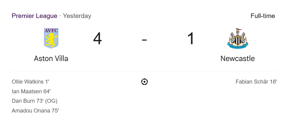 จาก : ผลบอลสด พรีเมียร์ลีก 2025 ระหว่าง แอสตัน วิลล่า 4-1 นิวคาสเซิ่ล ยูไนเต็ด วันนี้ 19/4/68 – บ้านกีฬา