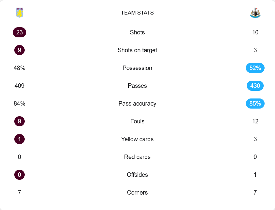 วิลล่าครองบอล 48% มีโอกาสยิงถึง 23 ครั้ง เข้ากรอบ 9 ครั้ง ขณะที่นิวคาสเซิ่ลครองบอล 52% ยิงเพียง 10 ครั้ง เข้ากรอบ 3 ครั้ง การผ่านบอลทั้งสองทีมใกล้เคียงกัน วิลล่าจ่าย 409 ครั้งด้วยความแม่นยำ 84% ส่วนนิวคาสเซิ่ลจ่าย 430 ครั้ง ความแม่นยำ 85% เกมนี้มีใบเหลืองรวม 4 ใบ โดยวิลล่า 1 ใบ นิวคาสเซิ่ล 3 ใบ ถือเป็นเกมที่วิลล่ากระหน่ำบุกเต็มพิกัดสมกับสกอร์ขาดลอย