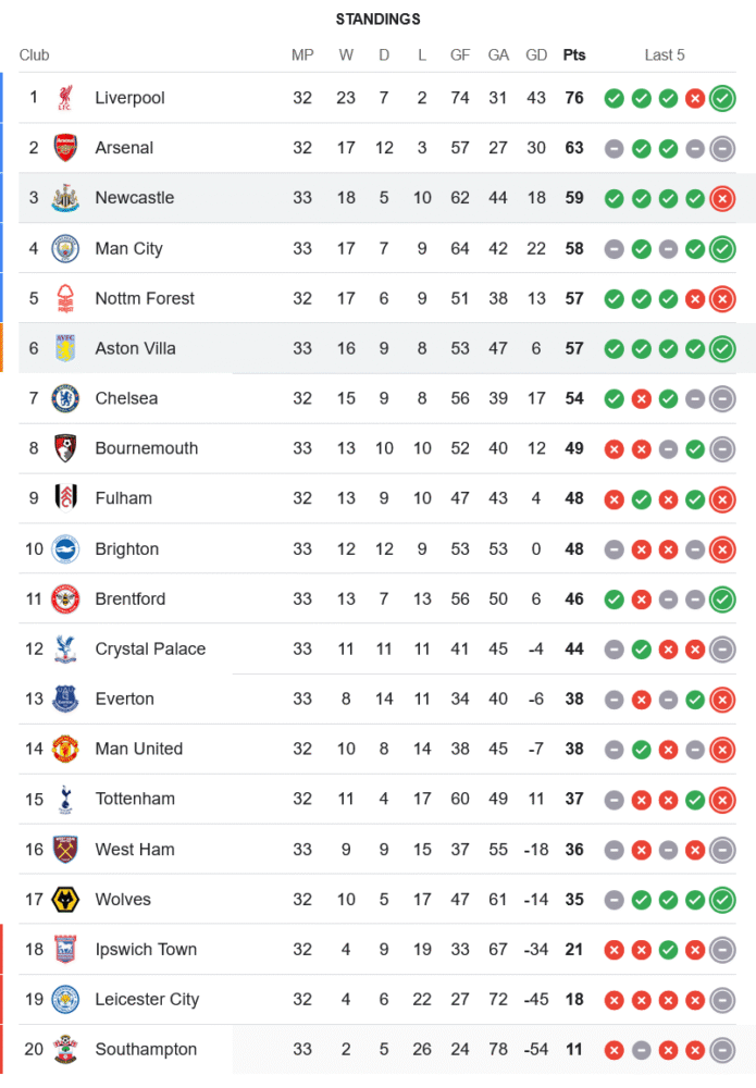 หลังคว้า 3 แต้มสุดล้ำค่า วิลล่าเก็บเพิ่มเป็น 57 คะแนนจาก 33 นัด ไล่จี้ น็อตติ้งแฮม ฟอเรสต์ อันดับ 5 แบบหายใจรดต้นคอ ขณะที่นิวคาสเซิ่ลแม้ยังรั้งอันดับ 3 แต่โดนวิลล่าและแมนซิตี้จี้มาแบบกระชั้น หากไม่รีบคืนฟอร์มมีสิทธิ์หลุดจากท็อปโฟร์แน่นอน