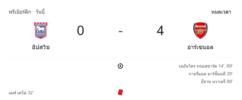 บ้านกีฬา ขอสรุปสั้นๆ ว่าเกมนี้ อาร์เซนอล เหนือกว่าอิปสวิชทุกกระเบียดนิ้ว ทั้งการครองบอล, ความเฉียบคมในจังหวะยิง และความแข็งแกร่งในแดนกลาง การได้เปรียบตัวผู้เล่นตั้งแต่ครึ่งแรกยิ่งทำให้ “ปืนใหญ่” เดินเกมตามแผนที่วางไว้สบายๆ ชัยชนะนัดนี้ทำให้พวกเขาส่งสัญญาณชัดว่าพร้อมไล่ล่าแชมป์แบบเต็มตัว!