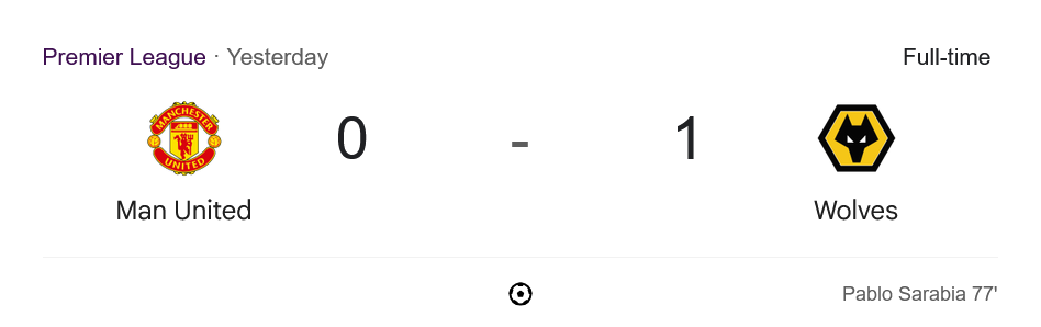 ครึ่งหลัง รูเบน อาโมริม นายใหญ่ปีศาจแดงขยับเปลี่ยนตัวหลายคน หวังเพิ่มความสดในแนวรุก แต่กลายเป็นวูล์ฟส์ที่ได้เฮในนาทีที่ 77 เมื่อ ปาโบล ซาราเบีย ตัวสำรองของทีมเยือนกระทุ้งประตูชัยสุดคมกริบ หลังรับบอลจากจังหวะสวนกลับเร็ว แม้แมนยูจะโหมบุกอย่างหนักช่วงท้ายเกม แต่เจาะแนวรับวูล์ฟส์ไม่เข้า จบเกมพ่ายคาบ้านแบบสุดช้ำ 0-1