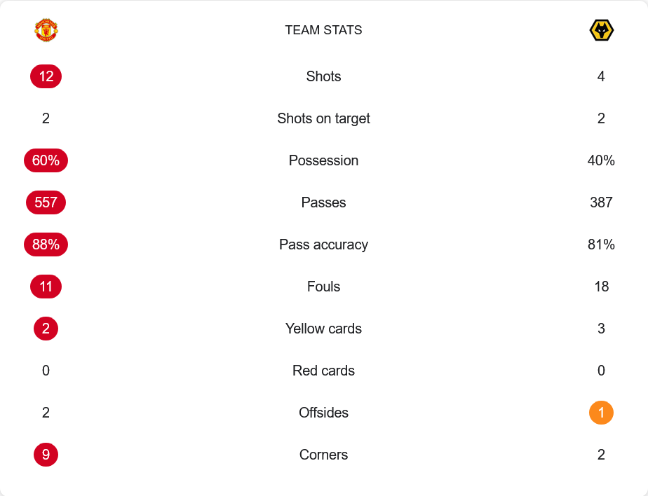 แมนเชสเตอร์ ยูไนเต็ดครองบอลได้ถึง 60% ผ่านบอลทั้งหมด 557 ครั้งด้วยความแม่นยำ 88% และมีโอกาสยิงถึง 12 ครั้ง แต่ยิงตรงกรอบแค่ 2 ครั้ง ขณะที่วูล์ฟส์แม้จะครองบอลเพียง 40% ผ่านบอล 387 ครั้ง แม่นยำ 81% และยิงเพียง 4 ครั้ง แต่เข้ากรอบ 2 ครั้ง พร้อมเปลี่ยนเป็น 1 ประตูสำคัญ ยูไนเต็ดได้เตะมุมถึง 9 ครั้ง ส่วนวูล์ฟส์ได้เพียง 2 ครั้ง ตลอดเกมมีใบเหลืองเกิดขึ้นรวม 5 ใบ ฝั่งปีศาจแดงโดนไป 2 ใบ ส่วนวูล์ฟส์โดนไป 3 ใบ