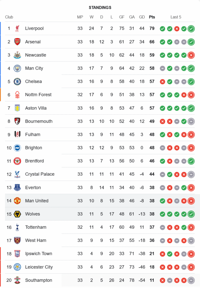 ความพ่ายแพ้นัดนี้ทำให้ แมนเชสเตอร์ ยูไนเต็ด ยังอยู่ที่อันดับ 14 ของตาราง พรีเมียร์ลีก 2025 มี 38 แต้มจาก 33 นัดเท่าเดิม และสุ่มเสี่ยงที่จะหล่นลงไปอีกหากไม่รีบเรียกฟอร์ม ขณะที่วูล์ฟส์ขยับแต้มเพิ่มเป็น 38 เท่ากัน แต่ลูกได้เสียยังเป็นรองอยู่อันดับ 15