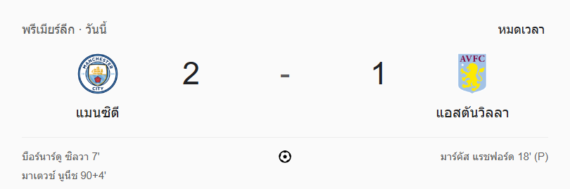 เกมนี้ แมนเชสเตอร์ ซิตี้ เกือบพลาด 3 แต้มคาบ้าน แต่ยังอาศัยความเยือกเย็นของด็อคูและนูนเญสในช่วงทดเจ็บ พลิกสถานการณ์กลับมาเก็บชัยชนะได้สำเร็จ ขณะที่ แอสตัน วิลล่า สู้ได้อย่างยอดเยี่ยม มีจังหวะสวนกลับอันตรายหลายครั้ง แต่จบไม่คมพอ ทำให้ ผลบอลสด ปิดเกมลงด้วยความระทึกแบบที่แฟนบอลพรีเมียร์ลีกต้องจำไปอีกนาน!