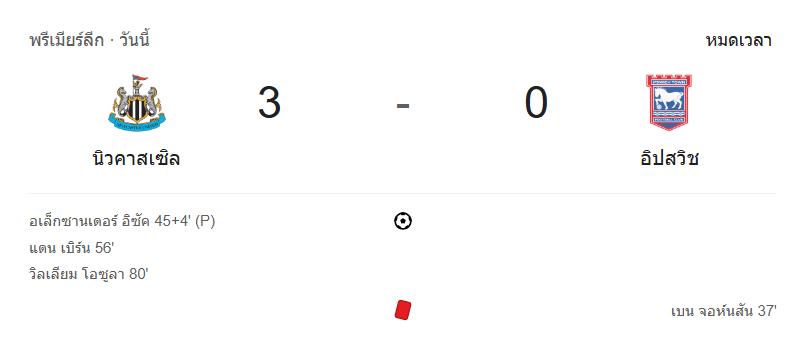 - จบเกม: นิวคาสเซิ่ล ยูไนเต็ด ถล่ม อิปสวิช ทาวน์ ไปอย่างขาดลอย 3-0 เก็บ 3 คะแนนเต็มในบ้านแบบสุดมันส์!