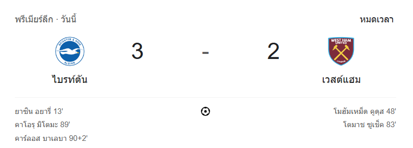 - นาทีที่ 95: หมดเวลาการแข่งขัน ไบรท์ตัน โฮฟ อัลเบี้ยน เก็บชัยแบบระทึกเหนือ เวสต์แฮม ยูไนเต็ด
