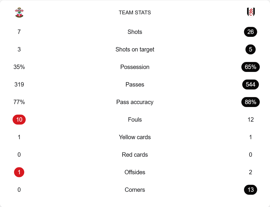 ฟูแล่มเหนือกว่าอย่างชัดเจนในเรื่องการครองบอลถึง 65% เทียบกับเซาแธมป์ตันที่มีเพียง 35% เท่านั้น ฟูแล่มยิงรวมถึง 26 ครั้ง เข้ากรอบ 5 ครั้ง ขณะที่เจ้าถิ่นยิงเพียง 7 ครั้ง เข้ากรอบ 3 ครั้ง จำนวนการผ่านบอลฟูแล่มสูงถึง 544 ครั้ง ด้วยความแม่นยำ 88% ส่วนเซาแธมป์ตันผ่านบอล 319 ครั้ง ความแม่นยำ 77% ฟูแล่มได้เตะมุมถึง 13 ครั้ง ขณะที่เซาแธมป์ตันไม่ได้เตะมุมเลย การฟาวล์ทั้งสองทีมใกล้เคียงกัน โดยเซาแธมป์ตันฟาวล์ 10 ครั้ง ฟูแล่มฟาวล์ 12 ครั้ง และมีใบเหลืองฝั่งละหนึ่งใบเท่ากัน