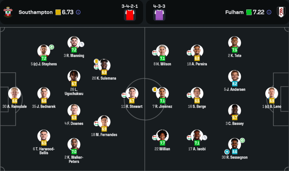 ไรอัน เซสเซยง คือผู้ปิดเกมให้ฟูแล่มด้วยฟอร์มการเล่นระดับพระกาฬ เติมเกมรุกจากแบ็กซ้ายได้อย่างดุดัน ทั้งยิงประตูชัยในช่วงทดเวลาบาดเจ็บและทำเกมได้โดดเด่นตลอดทั้งเกม รับคะแนนสูงสุดที่ 8.6 อย่างไร้ข้อกังขา