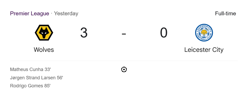 จาก : ผลบอลสด พรีเมียร์ลีก 2025 ระหว่าง วูล์ฟแฮมป์ตัน 3-0 เลสเตอร์ ซิตี้ วันนี้ 26/4/68 – บ้านกีฬา