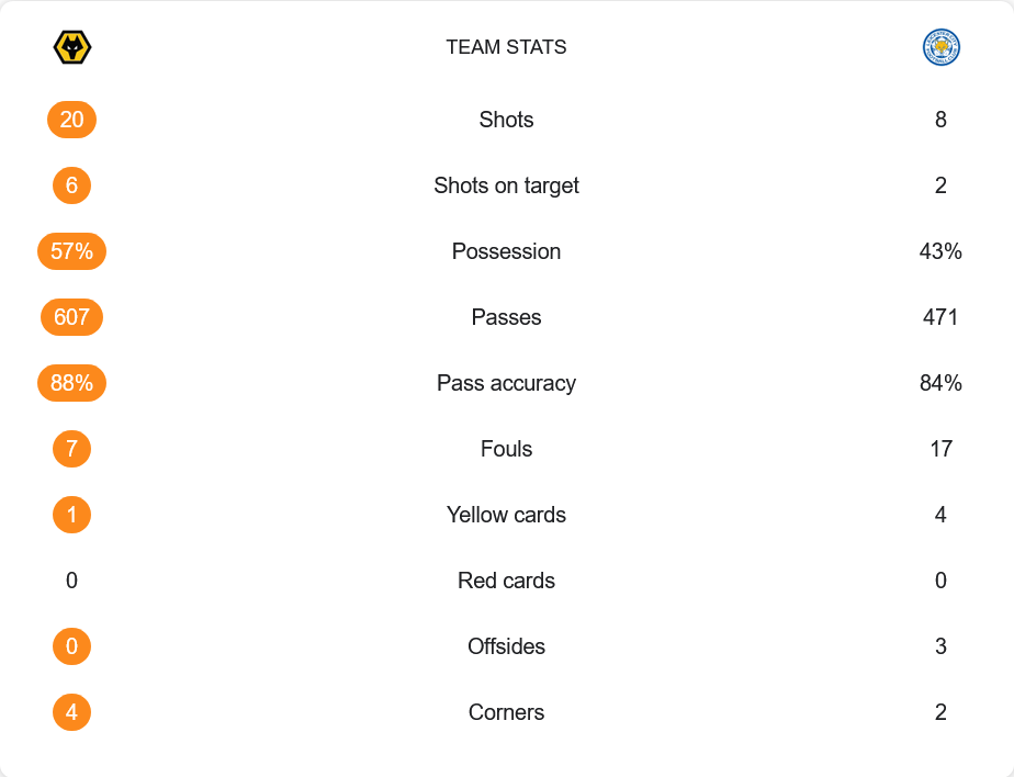 ตลอดเกม วูล์ฟส์ครองบอลได้ 57% เทียบกับเลสเตอร์ที่มีเพียง 43% ยิงรวมถึง 20 ครั้ง เข้ากรอบ 6 ครั้ง ส่วนเลสเตอร์ยิงแค่ 8 ครั้ง เข้ากรอบเพียง 2 ครั้ง การผ่านบอลของวูล์ฟส์แม่นยำถึง 88% จากจำนวน 607 ครั้ง ขณะที่เลสเตอร์ผ่านบอล 471 ครั้ง แม่นยำ 84% วูล์ฟส์ได้เตะมุม 4 ครั้ง ส่วนเลสเตอร์ได้เพียง 2 ครั้ง ฟาล์วรวม วูล์ฟส์ทำ 7 ครั้ง เลสเตอร์หนักกว่าทำถึง 17 ครั้ง และเลสเตอร์โดนใบเหลืองไปถึง 4 ใบในเกมนี้ด้วย