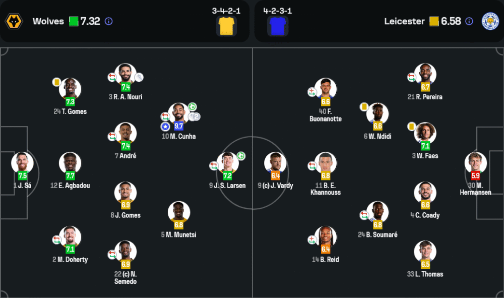 มาเธอุส คูนญ่า คือพระเอกของเกมอย่างแท้จริง ยิงหนึ่ง จ่ายสอง สร้างโอกาสให้เพื่อนร่วมทีมอย่างต่อเนื่อง และมีบทบาทสำคัญกับการพังประตูทั้งสามลูกของวูล์ฟส์ในเกมนี้ รับคะแนนสูงสุด 9.7 แบบไร้ข้อกังขา
