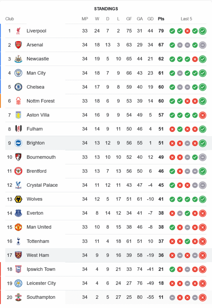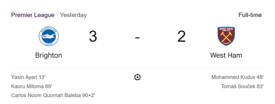 ชัยชนะนัดนี้ทำให้ ไบรท์ตัน เก็บเพิ่มเป็น 51 คะแนน รั้งอันดับ 9 ร่วมกับฟูแล่ม สถานการณ์กลับมามีลุ้นพื้นที่ยุโรปอย่างเต็มตัว ส่วน เวสต์แฮม ยังจมอยู่ที่อันดับ 17 มี 36 คะแนน เสี่ยงตกชั้นสุด ๆ ต้องเร่งเก็บแต้มในสองเกมสุดท้ายให้ได้หากหวังรอดตาย