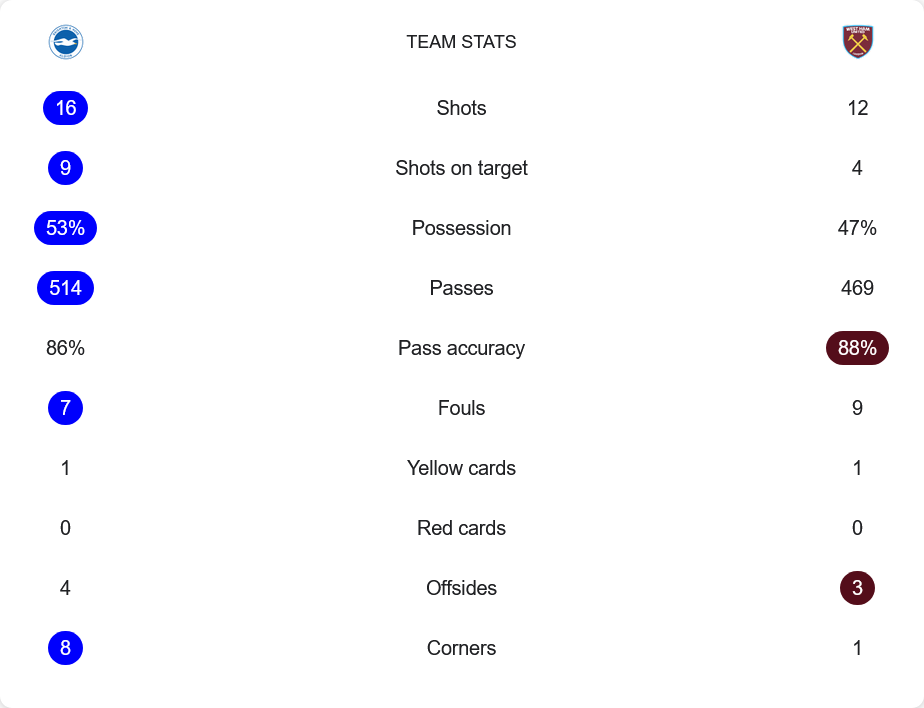 แม้สกอร์จะเบียดกันอย่างสูสี แต่ตัวเลขในสนามบ่งบอกว่า ไบรท์ตัน ครองบอลได้ 53% เหนือกว่าเวสต์แฮมที่ 47% โดยเจ้าบ้านมีโอกาสยิงถึง 16 ครั้ง เข้ากรอบ 9 ครั้ง ขณะที่เวสต์แฮมยิง 12 ครั้ง เข้ากรอบ 4 ครั้ง ไบรท์ตันจ่ายบอลสำเร็จ 514 ครั้ง (ความแม่นยำ 86%) ส่วนเวสต์แฮมจ่าย 469 ครั้ง (แม่นยำ 88%) เรียกได้ว่าเป็นเกมที่สูสีทั้งด้านการครองบอลและการสร้างสรรค์โอกาส แต่ความเฉียบคมและแรงฮึดของเจ้าบ้านเป็นตัวตัดสินชัยชนะในที่สุด