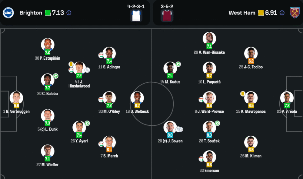 เกมนี้ ไบรท์ตัน วางแผนมาอย่างชัดเจนด้วยระบบ 4-2-3-1 ที่เน้นการครองบอลและคุมเกมแดนกลางเป็นหลัก ใช้ความเร็วของตัวริมเส้นอย่าง อาดิงรา และ มาร์ช คอยโจมตีแผงหลังเวสต์แฮมที่มีช่องโหว่อยู่บ่อยครั้ง ซึ่งรูปแบบการรุกที่ไหลลื่น และการเคลื่อนที่ของแดนกลางช่วยให้พวกเขากดดันคู่แข่งได้ต่อเนื่อง