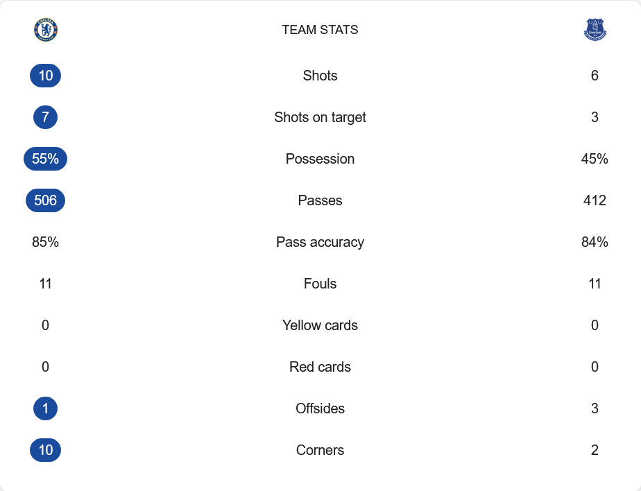 เชลซีมีสถิติการครองบอล 55% และมีโอกาสยิงถึง 10 ครั้ง ขณะที่เอฟเวอร์ตันได้แค่ 6 ครั้ง บ่งบอกชัดเจนถึงรูปแบบการบุกที่มีประสิทธิภาพมากกว่า ส่วนการรับของเชลซีมีระเบียบวินัยสูง ลดโอกาสเสี่ยงได้ดีโดยเฉพาะในช่วงท้ายเกมที่เอฟเวอร์ตันพยายามเร่งบุกหนัก