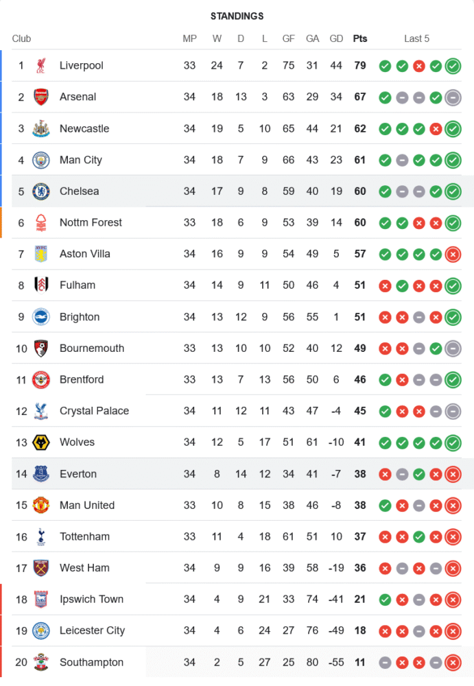 ชัยชนะนัดนี้ทำให้เชลซีเก็บเพิ่มเป็น 60 คะแนน เท่ากับน็อตติ้งแฮม ฟอเรสต์ในอันดับ 6 แต่ลูกได้เสียน้อยกว่า อยู่อันดับ 5 อย่างเหนียวแน่น มีลุ้นโควตายูโรปาลีกเต็มตัว ส่วนเอฟเวอร์ตันยังคงอยู่ที่อันดับ 14 มี 38 คะแนนเท่ากับแมนฯ ยูไนเต็ด แต่ลูกได้เสียดีกว่าเพียงเล็กน้อย ยังต้องดิ้นรนหนีตกชั้นในช่วงโค้งสุดท้าย
