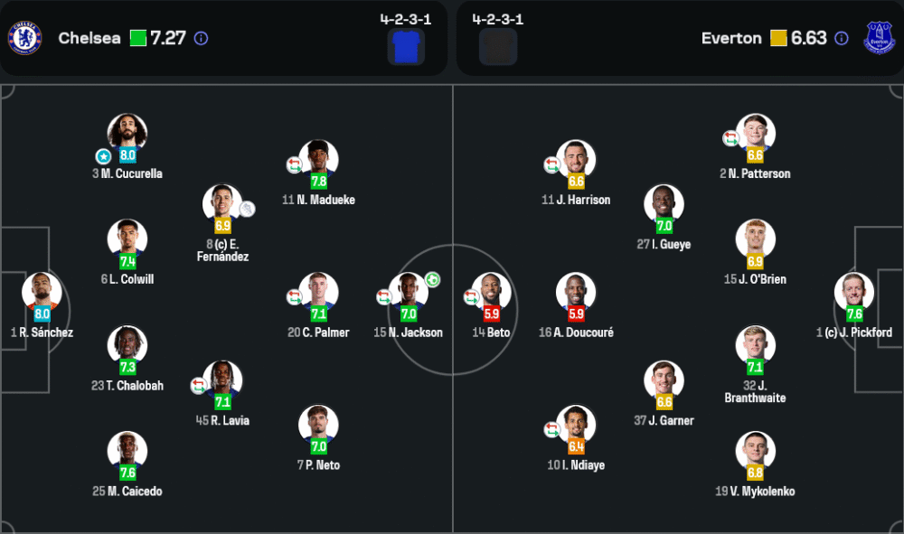 กองกลาง: โรเมโอ ลาเวีย (7.1), เอนโซ่ เฟร์นานเดซ (6.9), โคล พาล์มเมอร์ (7.1)