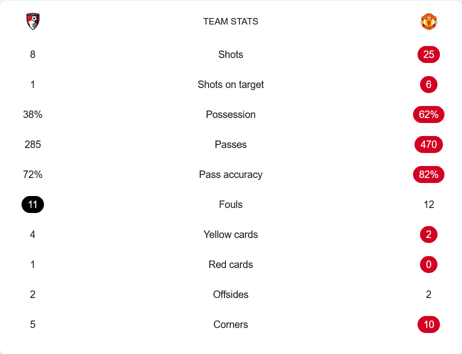 แม้ว่าสกอร์จะเสมอกัน แต่ แมนฯ ยูไนเต็ด เป็นฝ่ายกดดันได้ตลอด โดยมีโอกาสยิงถึง 25 ครั้ง เข้ากรอบ 6 ครั้ง และได้เตะมุมถึง 10 ครั้ง เทียบกับบอร์นมัธที่ยิงเพียง 8 ครั้งและเข้ากรอบแค่หนเดียว การครองบอลก็เป็นของปีศาจแดงถึง 62% ด้วยความแม่นยำในการผ่านบอลที่ 82% เทียบกับบอร์นมัธที่มีแค่ 72% ขณะที่บอร์นมัธเน้นตั้งรับเต็มที่จนทำฟาวล์ไปถึง 11 ครั้ง และต้องรับใบแดงหนึ่งใบสำคัญที่ส่งผลต่อรูปเกมโดยตรง