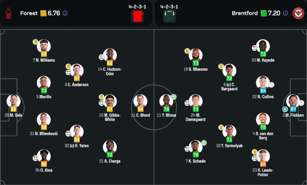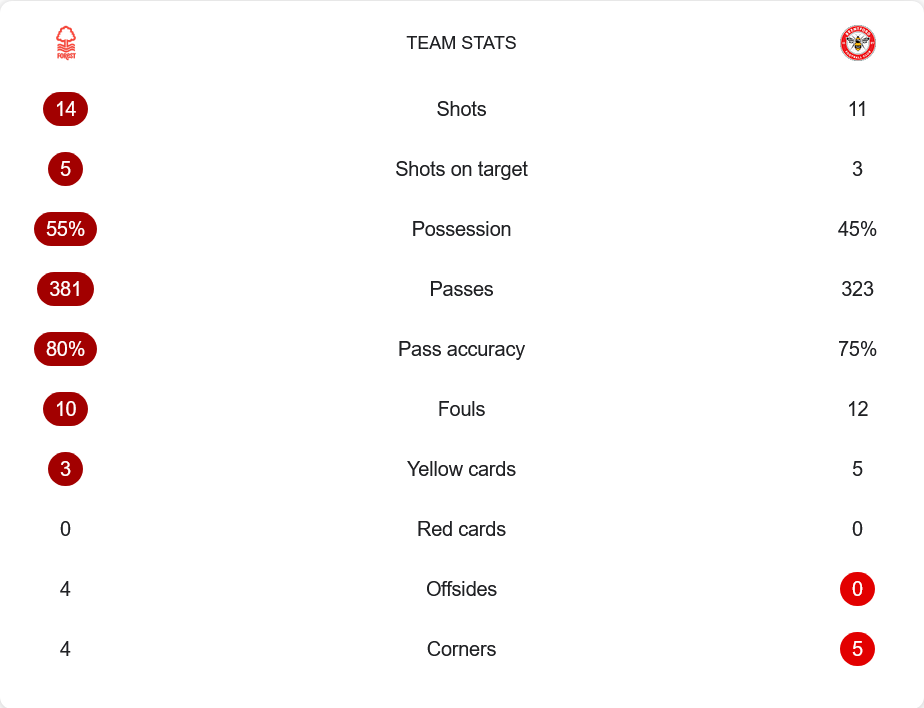 แม้ฟอเรสต์จะมีโอกาสยิงมากกว่าถึง 14 ครั้ง และครองบอลได้ 55% แต่กลับยิงตรงกรอบแค่ 5 ครั้ง ต่างจากเบรนท์ฟอร์ดที่มีโอกาสยิงเพียง 11 ครั้ง แต่ตรงกรอบถึง 3 และเปลี่ยนเป็น 2 ประตูอย่างเฉียบขาด ฟอเรสต์จ่ายบอลแม่นยำกว่าเล็กน้อยที่ 80% เทียบกับเบรนท์ฟอร์ด 75% แต่ในจังหวะจบสกอร์ ทีมเยือนเฉียบคมกว่าอย่างเห็นได้ชัด ด้านเกมรับ เบรนท์ฟอร์ดโดนใบเหลืองถึง 5 ใบ แต่ไม่มีความผิดพลาดร้ายแรง ขณะที่ฟอเรสต์ครองบอลได้มากแต่ขาดประสิทธิภาพในพื้นที่สุดท้าย