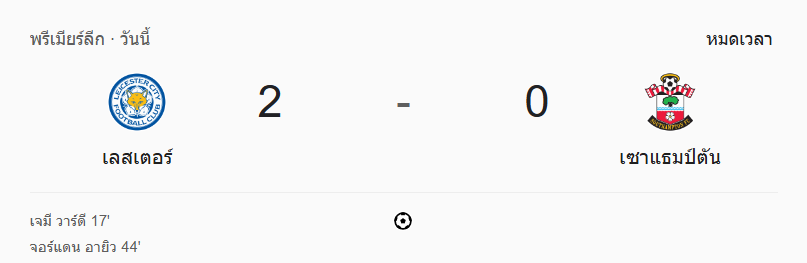 - นาทีที่ 95: จบเกม! ผลบอลสด ขาดลอยชัดเจน เลสเตอร์ ซิตี้ เปิดบ้านเอาชนะ เซาแธมป์ตัน 2-0 เก็บสามแต้มสำคัญไล่ล่ากลุ่มบนของตารางต่อไป