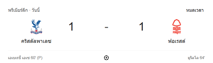 • จบการแข่งขัน: คริสตัล พาเลซ เสมอกับ น็อตติ้งแฮม ฟอเรสต์ ไปแบบสุดมันส์ 1-1 แบ่งกันไปทีมละแต้มในเกมที่เต็มไปด้วยจังหวะปะทะ, จุดโทษ, และความเข้มข้นที่ลุ้นกันยันนาทีสุดท้าย