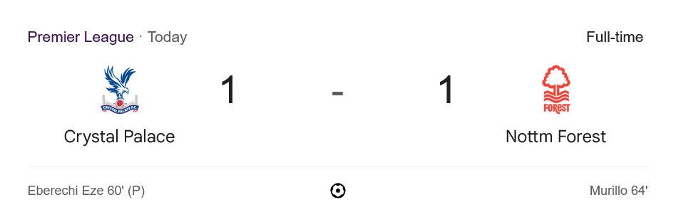 จาก : ผลบอลสด พรีเมียร์ลีก 2025 ระหว่าง คริสตัล พาเลซ 1-1 น็อตติ้งแฮม ฟอเรสต์ วันนี้ 6/5/68 – บ้านกีฬา