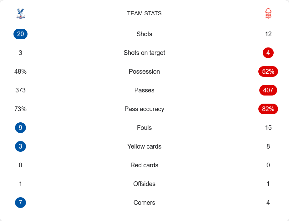 เกมนี้ พาเลซมีโอกาสยิงมากถึง 20 ครั้ง แต่ตรงกรอบแค่ 3 ส่วนฟอเรสต์ยิงน้อยกว่าที่ 12 ครั้ง แต่เข้ากรอบถึง 4 และทำได้ดีกว่าในเรื่องของการครองบอลที่ 52% กับการจ่ายบอล 407 ครั้ง พร้อมความแม่นยำ 82% ขณะที่พาเลซจ่ายบอลแม่นยำเพียง 73% และครองบอล 48% ส่วนใบเหลืองฟอเรสต์โดนไปถึง 8 ใบ เทียบกับพาเลซแค่ 3 ใบ ถือเป็นอีกหนึ่งเกมที่ทีมเยือนเล่นด้วยความเข้มข้นและฟาวล์บ่อยกว่าชัดเจน