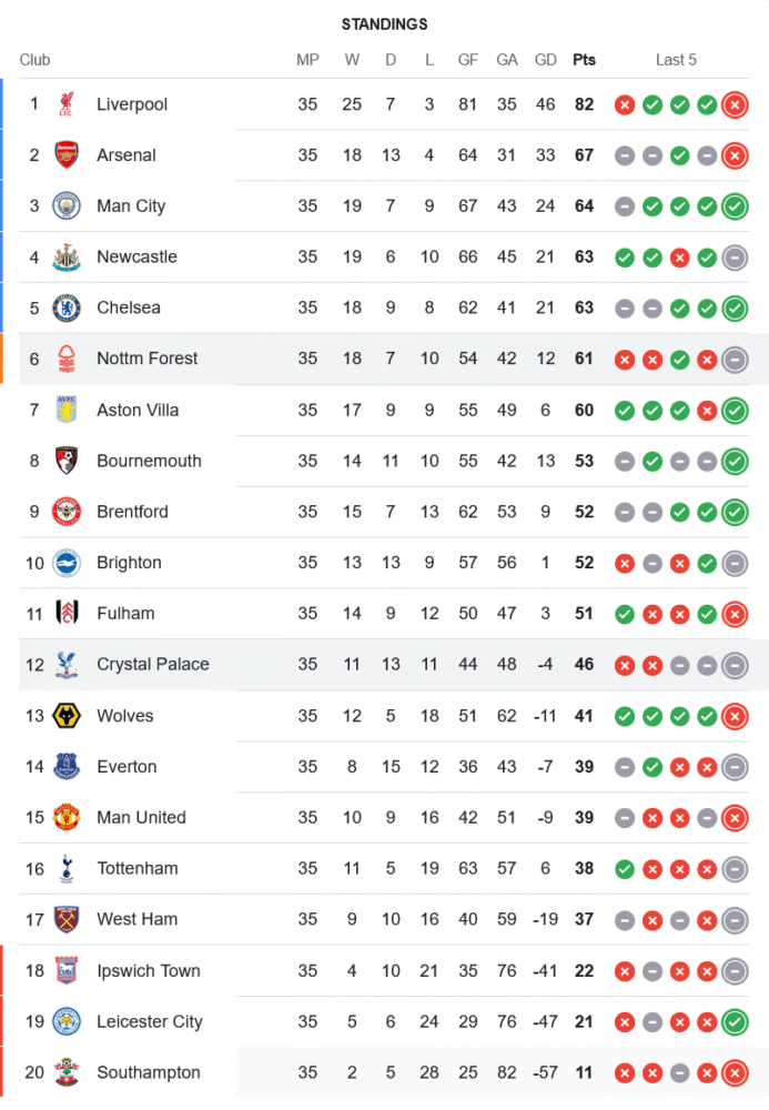 หลังจากจบเกมนี้ น็อตติ้งแฮม ฟอเรสต์ เก็บเพิ่ม 1 แต้ม ขยับเป็น 61 คะแนนจาก 36 นัด รั้งอันดับ 6 ของตารางพรีเมียร์ลีก ยังมีลุ้นพื้นที่ยุโรปต่อไป ส่วน คริสตัล พาเลซ มีเพิ่มเป็น 46 แต้ม รั้งอันดับ 12 ห่างโซนตกชั้นค่อนข้างปลอดภัย แต่หมดลุ้นพื้นที่ยุโรปแน่นอน