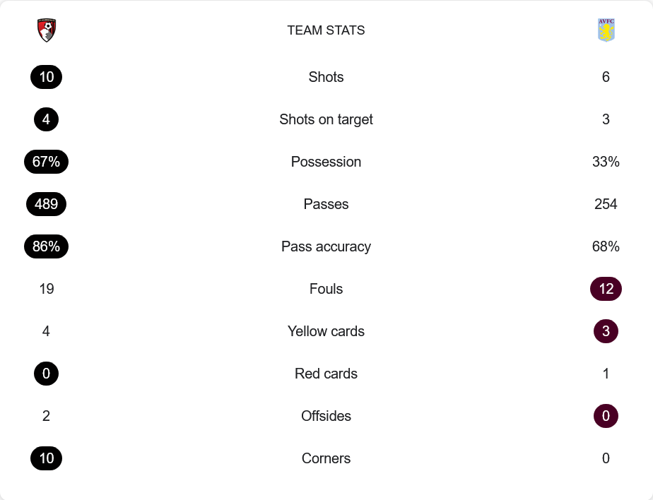 แม้จะพ่ายแพ้ แต่บอร์นมัธมีตัวเลขที่เหนือกว่าทุกมิติ ทั้งการครองบอลมากถึง 67% กับจำนวนการผ่านบอล 489 ครั้ง ซึ่งเทียบกับวิลล่าที่ผ่านบอลเพียง 254 ครั้งและครองเกมได้แค่ 33% อย่างไรก็ตาม แอสตัน วิลล่าคือทีมที่จบคมกว่าเมื่อสามารถยิงตรงกรอบ 3 จาก 6 ครั้ง ส่วนบอร์นมัธแม้จะมีโอกาสยิง 10 ครั้ง แต่ตรงกรอบเพียง 4 ครั้ง นอกจากนี้เจ้าบ้านได้เตะมุมถึง 10 ครั้ง แต่ก็ไม่สามารถเปลี่ยนเป็นประตูได้ ขณะที่ทีมเยือนไม่ได้เตะมุมเลยตลอดทั้งเกม