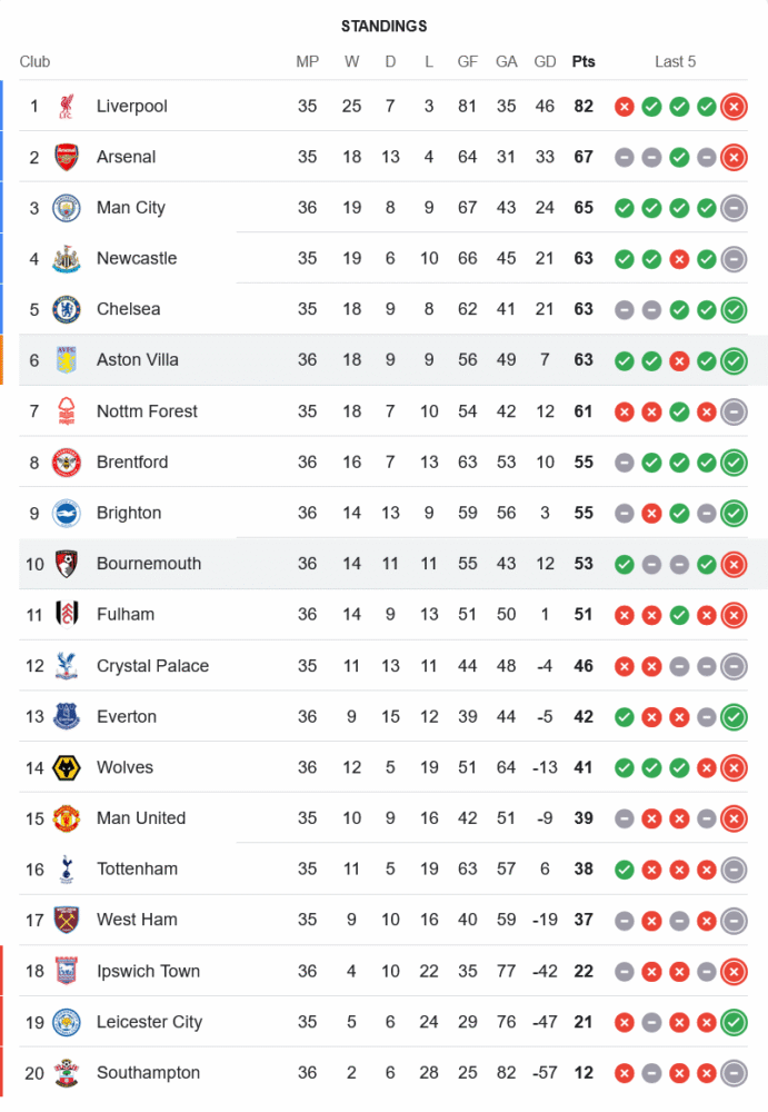 ชัยชนะของแอสตัน วิลล่าทำให้พวกเขาเก็บเพิ่มเป็น 63 แต้มจาก 36 นัด เท่ากับเชลซีและนิวคาสเซิล รั้งอันดับ 6 ของตารางพรีเมียร์ลีก โดยยังมีลุ้นพื้นที่ยุโรปเต็มตัว ส่วนบอร์นมัธแม้จะแพ้แต่ยังอยู่อันดับ 10 มี 53 แต้ม ความหวังจบ Top 10 ยังคงอยู่ในมือ