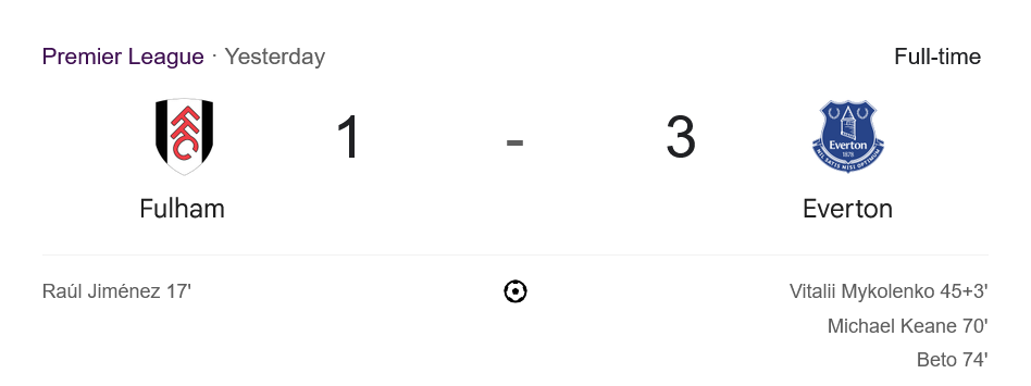 เข้าสู่ครึ่งหลัง เอฟเวอร์ตันเพิ่มจังหวะการเล่นมากขึ้น และได้ผลในนาทีที่ 70 จากลูกเตะมุมที่แม็คนีลเปิดให้ไมเคิล คีนขึ้นโขกเต็มหัวแซงนำ 2-1 ถัดมาแค่ 4 นาที เบโต้ก็บวกสกอร์ที่สามให้ทีมเยือนอย่างเฉียบขาด ทำให้แม้ฟูแล่มจะพยายามไล่ตีตื้นแต่สุดท้ายก็ไม่ทัน จบเกม เอฟเวอร์ตันคว้าชัย 3-1 พร้อมขยับอันดับอย่างมีความหมาย