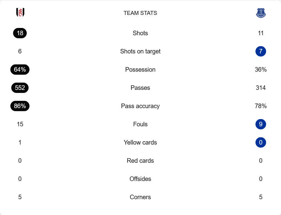 แม้ฟูแล่มจะมีเปอร์เซ็นต์การครองบอลถึง 64% และผ่านบอลมากถึง 552 ครั้งด้วยความแม่นยำถึง 86% แต่กลับไม่สามารถเปลี่ยนการครองบอลเป็นประตูได้ ต่างจากเอฟเวอร์ตันที่ครองบอลแค่ 36% แต่สร้างโอกาสยิงตรงกรอบถึง 7 ครั้งจากทั้งหมด 11 ครั้ง และทำได้ถึง 3 ประตู พวกเขายังเล่นได้อย่างมีวินัย มีฟาวล์แค่ 9 ครั้ง และไม่มีใบเหลืองหรือแดง ขณะที่ฟูแล่มเสียฟาวล์ถึง 15 ครั้งและโดนใบเหลืองหนึ่งใบ สถิติมุมยังเท่ากันที่ 5 ต่อ 5 แต่ความเฉียบคมของทีมเยือนเป็นตัวตัดสินเกมนี้ชัดเจน