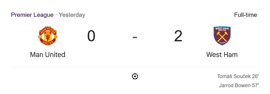 ครึ่งหลัง รูเบน อาโมริม เปลี่ยนตัวหลายรายเพื่อแก้เกม แต่กลับกลายเป็นเวสต์แฮมที่ยังคงรักษาระเบียบวินัยเกมรับได้ดีเยี่ยม และมีทีเด็ดสวนกลับในนาทีที่ 57 เมื่อ อารอน วาน-บิสซาก้า เปิดบอลจากกราบขวาให้ จาร็อด โบเว่น หลุดเข้ามาซัดไม่เหลือ เวสต์แฮมหนีห่างเป็น 2-0 เจ้าถิ่นครองบอลได้มากกว่าก็จริงแต่ไม่สามารถเจาะแนวรับของขุนค้อนที่เหนียวแน่นได้เลย จนกระทั่งจบเกมไปแบบไร้สกอร์ตอบโต้ ทำให้แมนยูต้องพ่ายคารังไปอย่างเจ็บแสบ