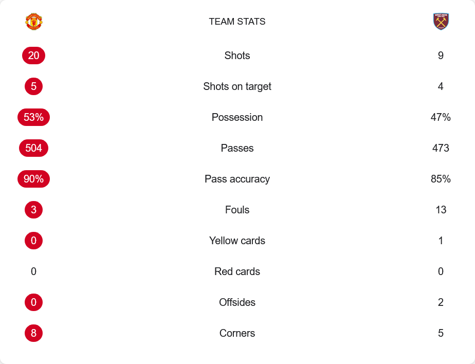 แม้ปีศาจแดงจะได้เปรียบในเรื่องของการครองบอล 53% ต่อ 47% และผ่านบอลมากถึง 504 ครั้ง ขณะที่เวสต์แฮมทำได้ 473 ครั้ง แต่เกมรับของทีมเยือนแข็งแกร่งจนเจ้าถิ่นแทบเจาะไม่เข้า อีกทั้งเวสต์แฮมยังยิงตรงกรอบ 4 จาก 9 ครั้ง ซึ่งกลายเป็น 2 ประตูที่เฉียบขาด ต่างจากเจ้าบ้านที่ยิง 20 ครั้งแต่เปลี่ยนเป็นประตูไม่ได้เลย เวสต์แฮมโดนฟาวล์เยอะกว่าถึง 13 ครั้ง และได้ใบเหลืองหนึ่งใบ ส่วนแมนยูไม่มีใบเหลืองหรือใบแดง แต่เกมรับที่หลวมทำให้ต้องจ่ายราคาแพงในเกมนี้