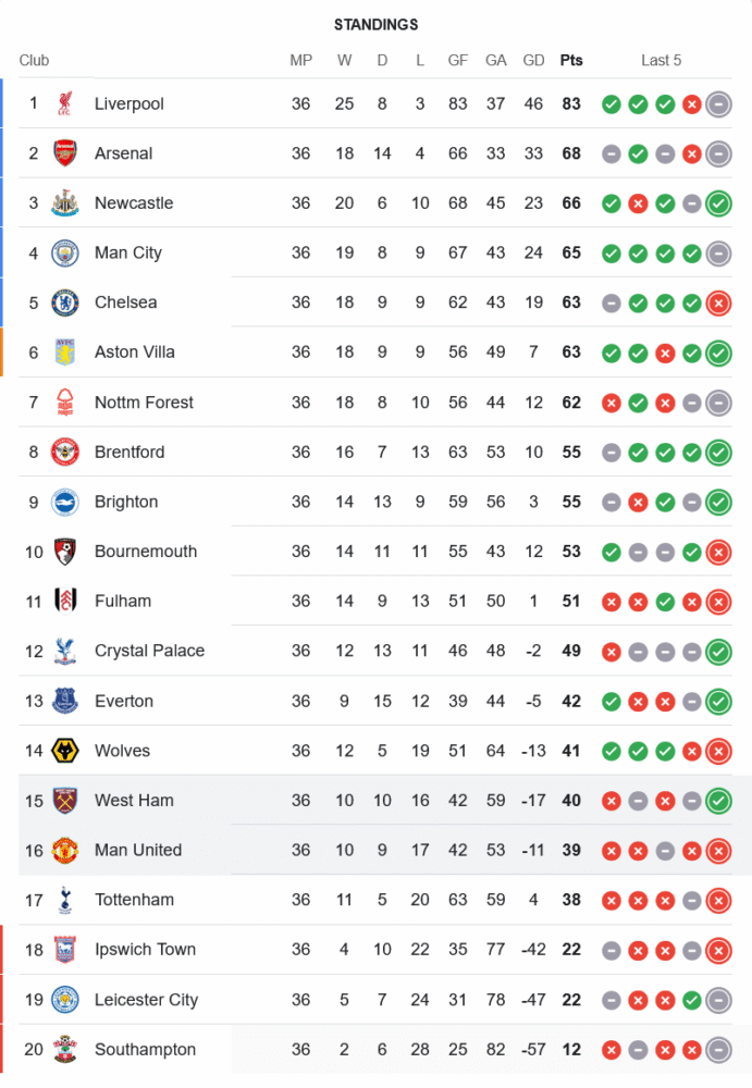 เวสต์แฮม ยูไนเต็ด ขยับขึ้นมารั้งอันดับ 15 มี 40 คะแนนจาก 36 นัด ขยับเหนือ แมนเชสเตอร์ ยูไนเต็ด ที่หล่นไปอยู่ที่ 16 มี 39 คะแนนเท่าเดิม เกมนี้ถือเป็นจุดเปลี่ยนสำคัญที่ทำให้ขุนค้อนยังมีลมหายใจในการจบอันดับกลางตาราง ขณะที่ผีแดงต้องดิ้นรนหนักกับโปรแกรมที่เหลือ และยังไม่แน่ว่าจะได้โควตาบอลยุโรปในฤดูกาลหน้า