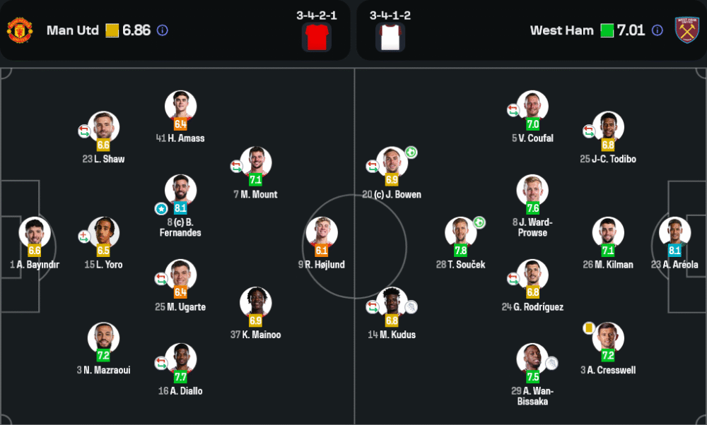 แม้ แมนเชสเตอร์ ยูไนเต็ด จะพ่ายแพ้คารัง แต่ “บรูโน่ แฟร์นันด์ส” กัปตันทีมของปีศาจแดงยังคงเป็นหัวใจหลักของทีม โชว์ฟอร์มโดดเด่นทั้งการจ่ายบอลและคุมจังหวะ ได้คะแนนสูงถึง 8.1 เช่นเดียวกับ อัลฟองส์ อาเรโอล่า ผู้รักษาประตูของเวสต์แฮม ที่เซฟสำคัญหลายจังหวะ จนพาทีมเก็บคลีนชีตกลับลอนดอนแบบสมศักดิ์ศรี