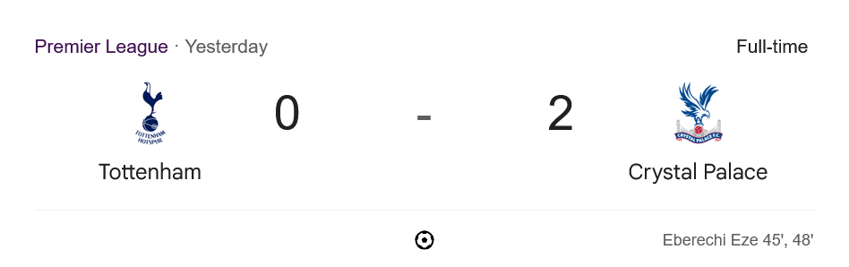 จาก : ผลบอลสด พรีเมียร์ลีก 2025 ระหว่าง ท็อตแน่ม ฮ็อทสเปอร์ 0-2 คริสตัล พาเลซ วันนี้ 11/5/68 – บ้านกีฬา