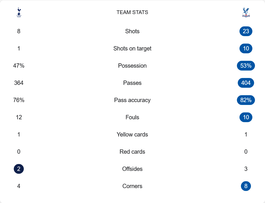 ในเกมนี้ คริสตัล พาเลซทำผลงานได้เหนือกว่าทุกด้าน โดยครองบอล 53% เทียบกับสเปอร์ส 47% และผ่านบอลมากกว่าที่ 404 ครั้ง เทียบกับเจ้าถิ่น 364 ครั้ง อีกทั้งมีความแม่นยำในการจ่ายบอลถึง 82% ส่วนสเปอร์สอยู่ที่ 76% แต่ที่ชัดเจนที่สุดคือจำนวนโอกาสยิง พาเลซยิง 23 ครั้ง เข้ากรอบ 10 ขณะที่สเปอร์สได้เพียง 8 ครั้ง และเข้ากรอบแค่ 1 ครั้งเท่านั้น ลูกเตะมุมก็เป็นของพาเลซถึง 8 ครั้ง ขณะที่สเปอร์สได้แค่ 4 ขณะที่ใบเหลืองเกิดขึ้นฝั่งละใบ และไม่มีใบแดงในเกมที่เต็มไปด้วยความดุดันแต่ควบคุมได้ดี