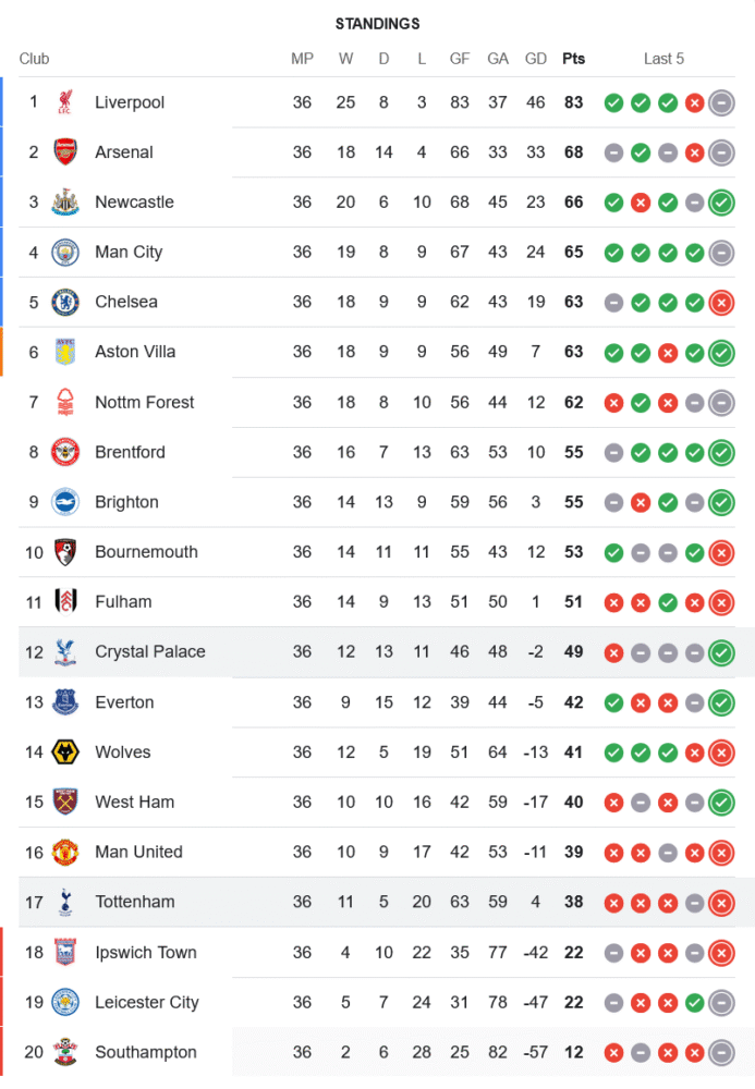 จากชัยชนะนัดนี้ทำให้ คริสตัล พาเลซ ขยับขึ้นมาอยู่ที่อันดับ 12 ของตารางพรีเมียร์ลีก มี 49 คะแนนจาก 36 นัด ยังมีลุ้นจบครึ่งบนของตาราง ขณะที่ ท็อตแน่ม ฮ็อทสเปอร์ ฟอร์มดิ่งต่อเนื่อง แพ้อีกครั้งจนหล่นไปอยู่อันดับ 17 มีเพียง 38 คะแนนจาก 36 นัด ยังเสี่ยงต่อการตกชั้นหากไม่เร่งฟอร์มใน 2 เกมสุดท้าย และต้องลุ้นให้คู่แข่งไม่เร่งทำแต้มแซง