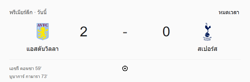 จบ 90 นาที วิลล่าเดินหน้าคว้าสามแต้มสำคัญ คุมเกมรุก-รับแน่นตลอดทั้งแมตช์ สเปอร์สแม้จะมีจังหวะสวนแต่ขาดความคม จบเกมนี้สาย ผลบอลสด ต้องยกนิ้วให้ลูกทีมของอูไน เอเมรี่ ที่ล่าประตู-เล่นดุดันตลอดเกม พุ่งทะยานลุ้นตั๋วยุโรปเต็มตัว!