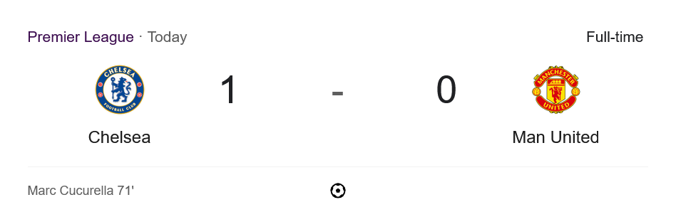 ครึ่งหลังเป็นจุดเปลี่ยนสำคัญ นาที 71 แฟนบอลเจ้าถิ่นได้เฮลั่นเมื่อ รีซ เจมส์ เติมเกมขึ้นมาทางขวาก่อนเปิดเข้ากลาง และเป็น มาร์ก กูคูเรญ่า ที่สอดขึ้นมาซัดเต็มข้อไม่เหลือซาก ส่งเชลซีขึ้นนำ 1-0 และกลายเป็นประตูชัยในเกมนี้ แม้แมนฯ ยูไนเต็ดจะพยายามแก้เกมเปลี่ยนตัวส่งการ์นาโช่, มาอิโน และอูการ์เต้ ลงมา แต่ก็ไม่สามารถสร้างความแตกต่างได้ สุดท้ายปีศาจแดงต้องจบเกมด้วยความพ่ายแพ้แบบไร้แต้มกลับบ้านอีกนัด