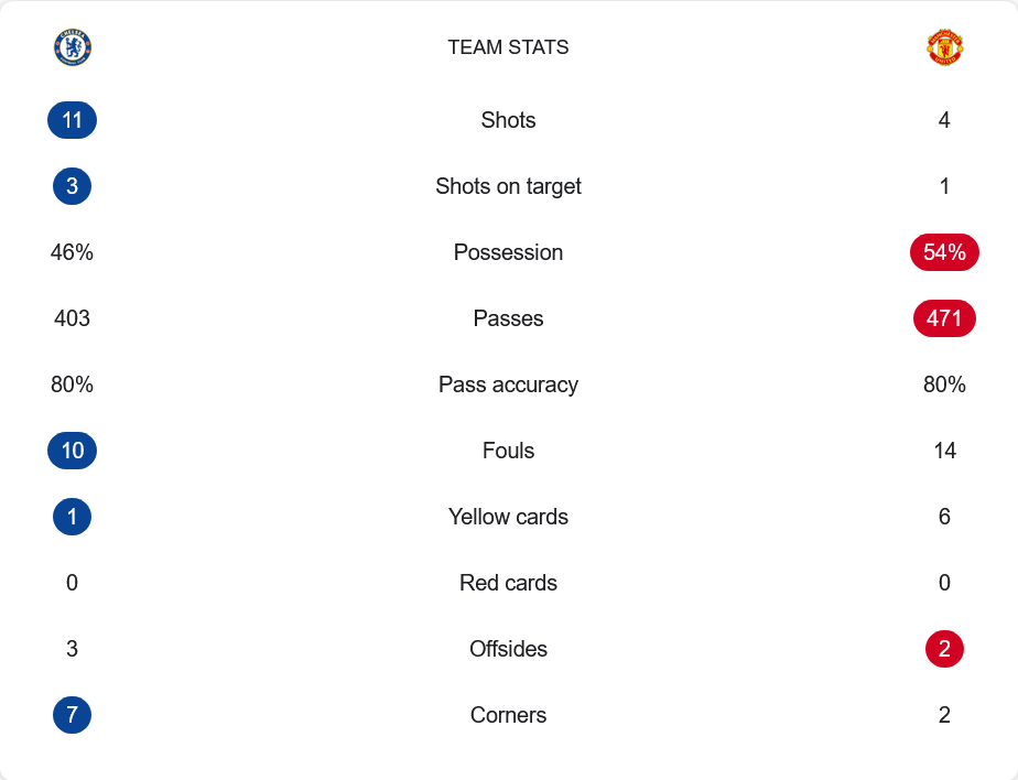 แม้แมนฯ ยูไนเต็ดจะครองบอลได้มากกว่าที่ 54% ต่อ 46% และมีจำนวนการผ่านบอลมากถึง 471 ครั้ง แต่กลับไม่สามารถสร้างอันตรายให้แนวรับเชลซีได้เลยเมื่อเทียบกับ 403 ครั้งของเจ้าบ้าน เชลซีเองมีโอกาสยิงมากกว่าอย่างชัดเจนที่ 11 ครั้ง เข้ากรอบ 3 ส่วนทีมเยือนยิงเพียง 4 ครั้งเข้ากรอบแค่ 1 นอกจากนี้ปีศาจแดงยังเสียฟาวล์ถึง 14 ครั้ง และโดนใบเหลืองถึง 6 ใบ เทียบกับเชลซีที่ฟาวล์ 10 และได้แค่ใบเหลืองเดียว ทั้งยังได้เตะมุมเพียง 2 ครั้ง ตลอดเกม
