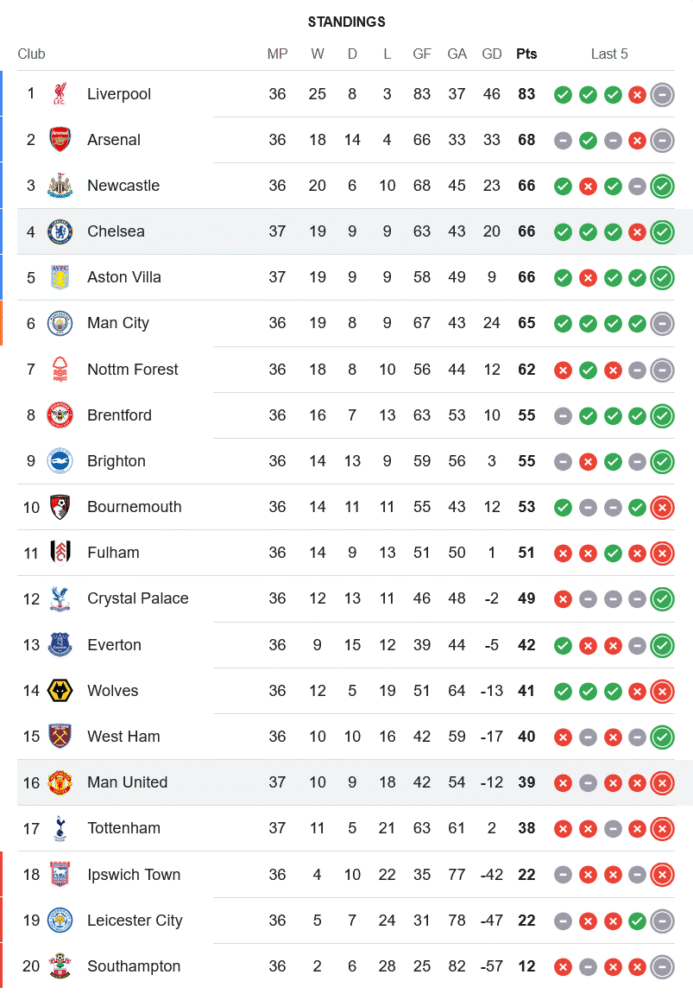 เชลซีขยับแต้มเป็น 66 คะแนนจาก 37 นัด เท่ากับแอสตัน วิลล่าและนิวคาสเซิล โดยรั้งอันดับ 4 ตามประตูได้เสีย โอกาสลุ้นตั๋วแชมเปียนส์ลีกยังคงเปิดกว้าง ในขณะที่ แมนเชสเตอร์ ยูไนเต็ด พ่ายรวด 2 เกมติด ทำให้ยังรั้งอันดับ 16 มีเพียง 39 คะแนน จาก 37 นัด ห่างจากโซนตกชั้นแค่แต้มเดียวเท่านั้น หากไม่ชนะในเกมสุดท้าย อาจต้องพบจุดจบที่ไม่คาดฝัน