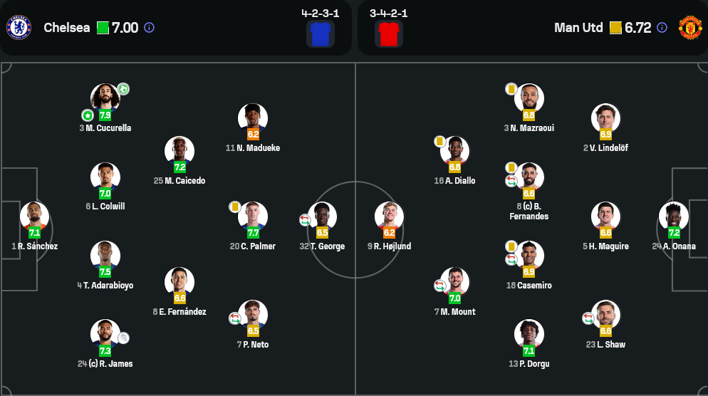 ตัวสำรองที่ถูกเปลี่ยนลง: มานูเอล อูการ์เต้ (แทน คาเซมิโร่ น.70), อเลฮานโดร การ์นาโช่ (แทน เมาท์ น.70), ไทเลอร์ เฮฟเว่น (แทน ลุค ชอว์ น.81), โคบี มาอิโน (แทน บรูโน่ น.81)