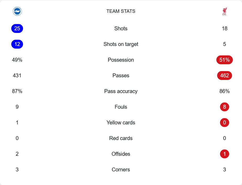 แม้ลิเวอร์พูลจะครองบอลมากกว่าที่ 51% และจ่ายบอลรวม 462 ครั้ง แต่ไบรท์ตันมีความเฉียบขาดและเข้าทำบ่อยครั้งกว่า โดยพวกเขามีโอกาสยิงถึง 25 ครั้ง เข้ากรอบ 12 ครั้ง เทียบกับหงส์แดงที่ยิงเพียง 18 ครั้งและเข้ากรอบเพียง 5 หน นอกจากนี้ ไบรท์ตันยังมีความแม่นยำในการส่งบอลที่สูงถึง 87% มีการเล่นเร็วและหลุดจากเพรสซิ่งได้ดี ขณะที่จังหวะเข้าทำจากการโต้กลับก็กลายเป็นหมัดเด็ดที่เล่นงานแนวรับของลิเวอร์พูลได้สำเร็จ