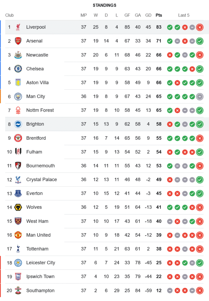 แม้ลิเวอร์พูลจะพ่ายแพ้ในนัดนี้แต่พวกเขายังคงนำจ่าฝูงที่ 83 คะแนน โดยทิ้งห่างอันดับ 2 อย่างอาร์เซน่อลอยู่ 12 แต้ม ซึ่งแม้จะแข่งเท่ากันแล้วแต่แชมป์ยังอยู่ในมือของ “หงส์แดง” ด้านไบรท์ตันขยับเพิ่มเป็น 58 แต้ม รั้งอันดับ 8 ต่อไป แต่ยังมีลุ้นเบียดขึ้นโซนยูโรป้าหากเกมสุดท้ายคว้าชัย